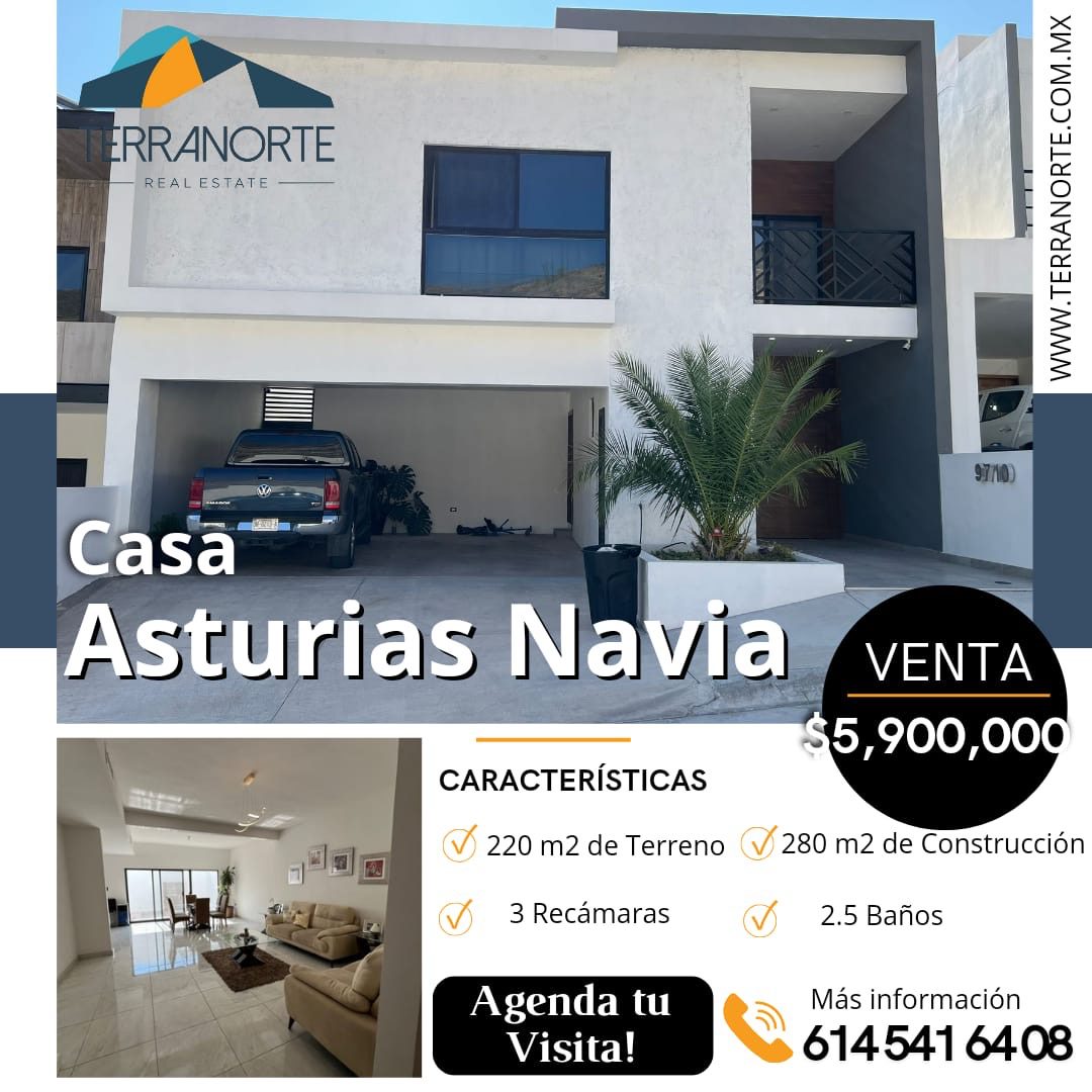 Asturias Navia 220 M2 de Terreno 280 M2 de Construcción 3 Recámaras 2.5 Baños Descripción Planta baja - Recibidor - 1/2 Baño - Sala-Comedor - Cocina - Lavandería - Bodeguita - Patio con alberca - Baño exterior - Cochera techada para dos vehículos Planta alta - Estancia - Estudio - Terraza - Recámara principal con vestidor y baño - 2 Recámaras secundarias con baño compartido Equipo - A/C lavado - Cisterna con hidroneumático - Ventanería doble vidrio - y más Precio: $5,900,000